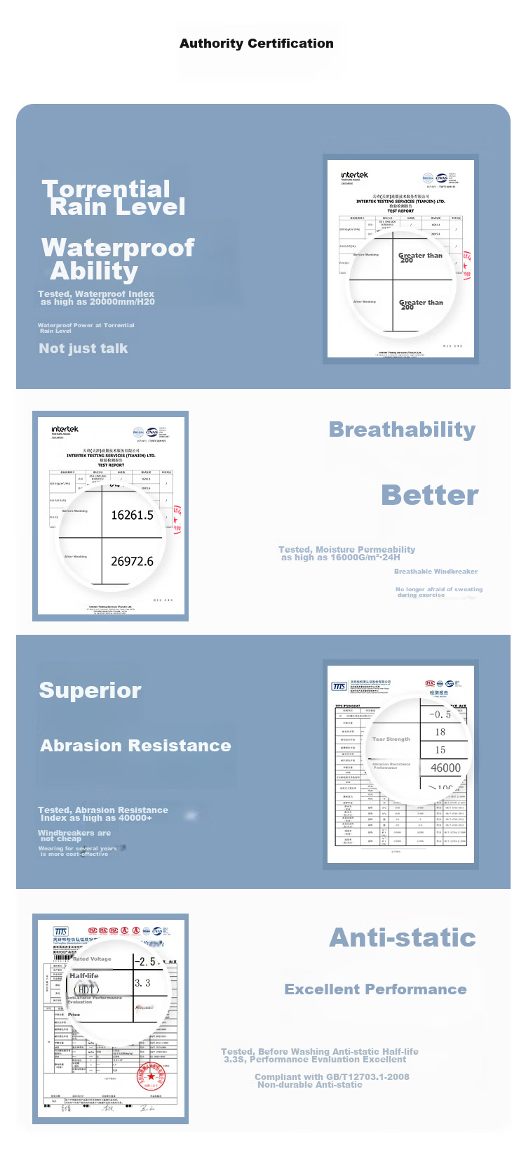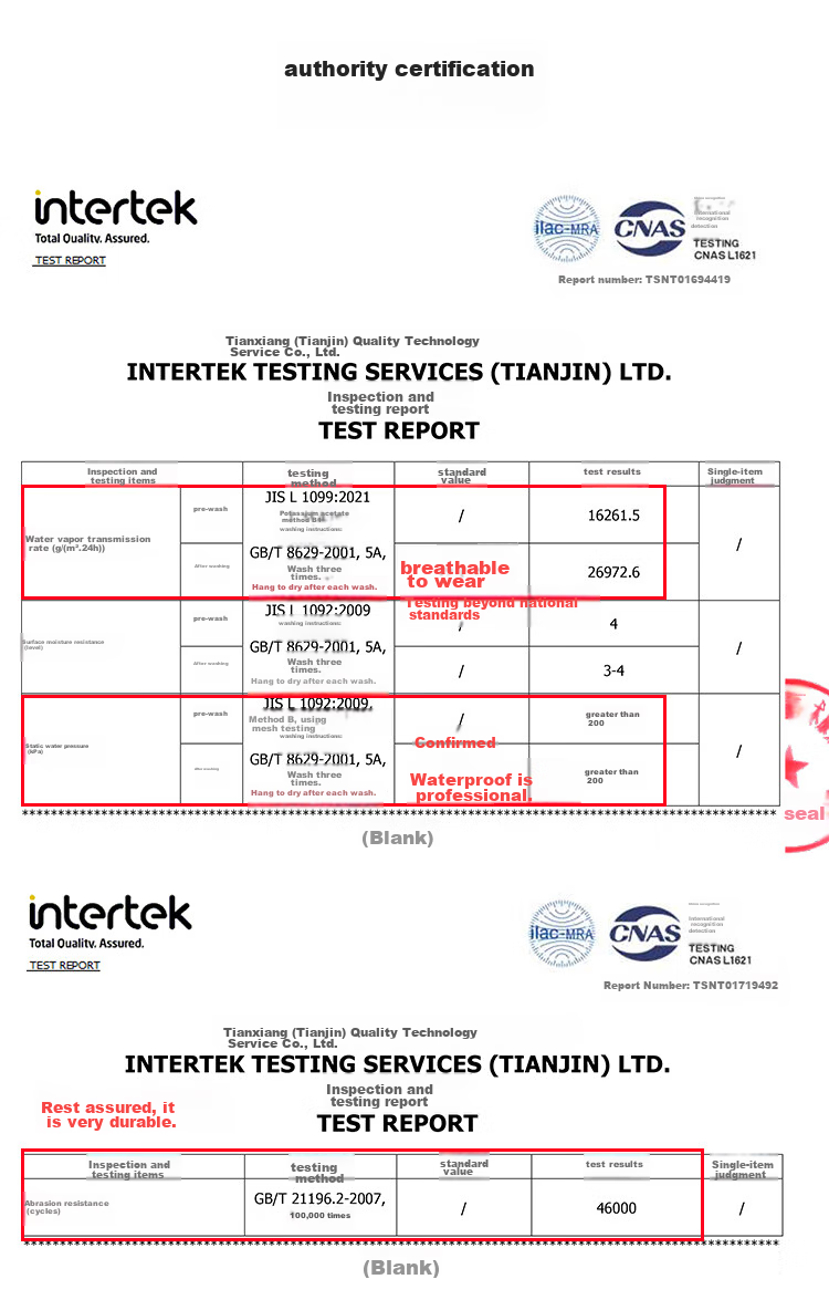 - Intertek certified for waterproofing and breathability