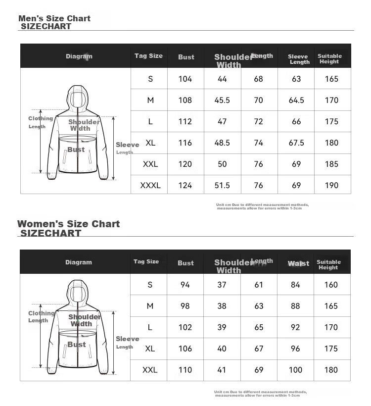 - XXXL: 124cm (chest), 51.5cm (shoulder width), 76cm (length), 69cm (sleeve length), 190cm (height)