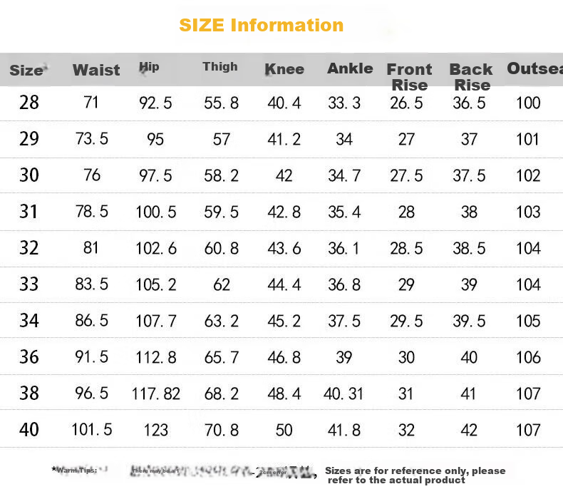 **Measurements:** Waist, hip, knee, ankle, front rise, inseam