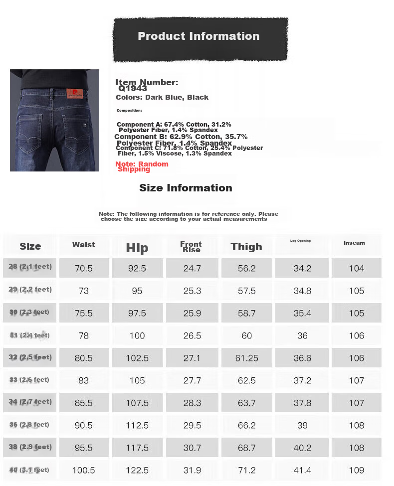 **Size Chart:** Waist, Hip, Thigh, Leg Opening, Front Rise, Back Rise, Length