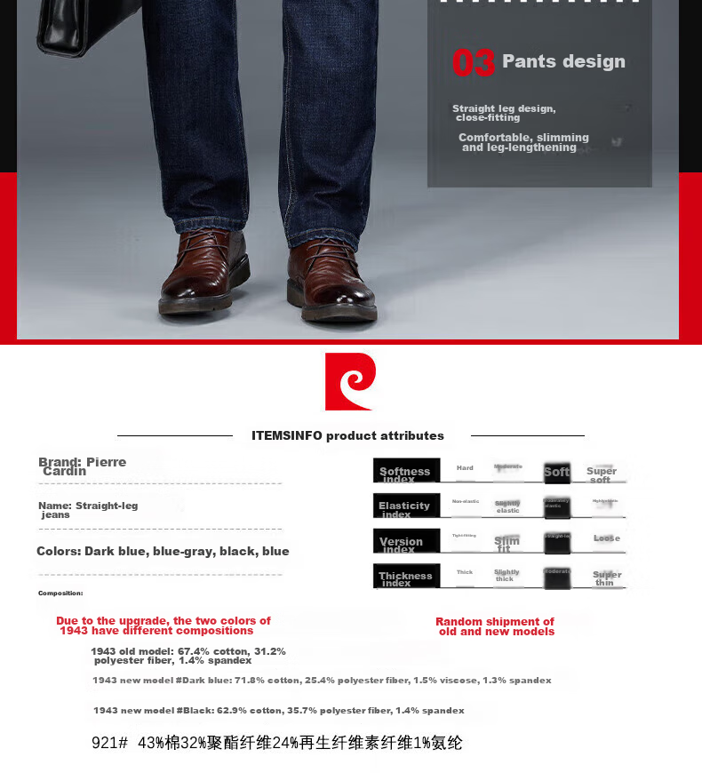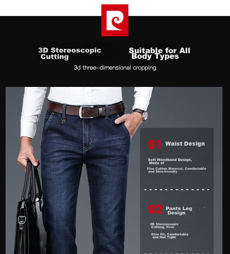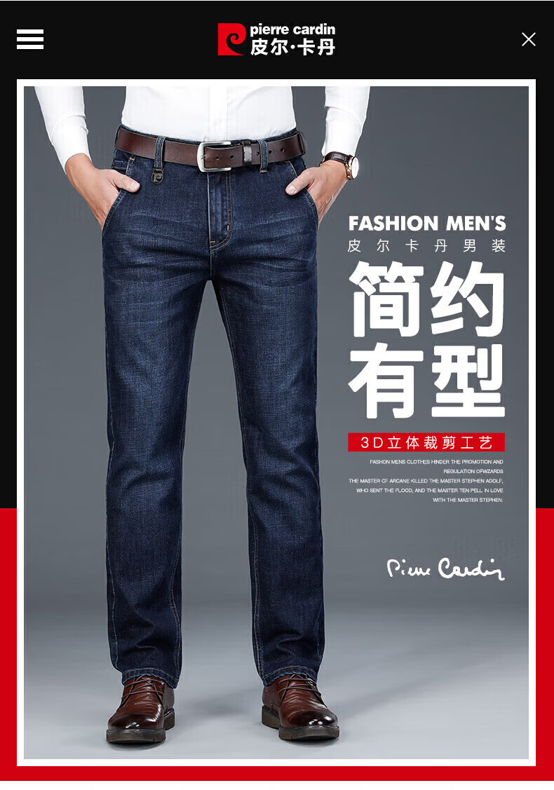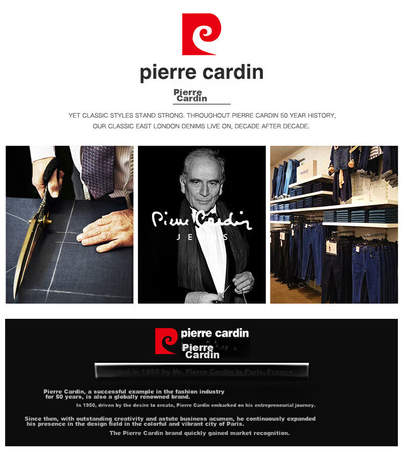 **Description:** Our classic East London denim lives on, decade after decade. Pierre Cardin, founded by Mr. Pierre Cardin in Paris, France in 1950, has been a successful exemplar in the fashion industry for 50 years and a globally renowned brand. With outstanding creativity and astute business acumen, Pierre Cardin continuously explores the design field and quickly captured the market in the vibrant city of Paris.