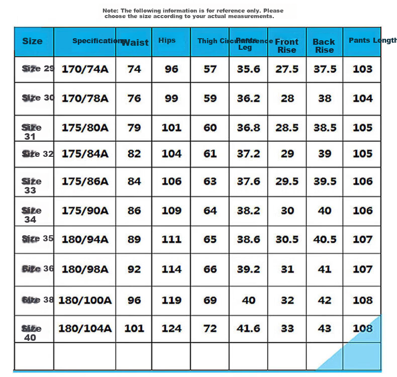 - Please refer to the following measurements for selecting the appropriate size: