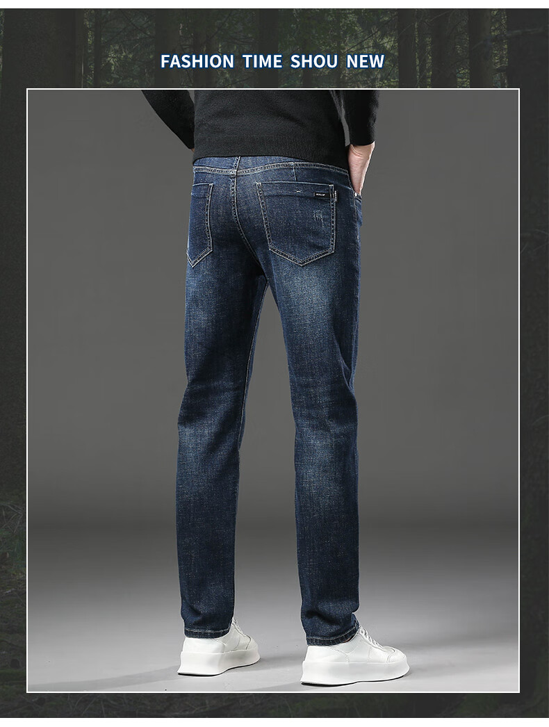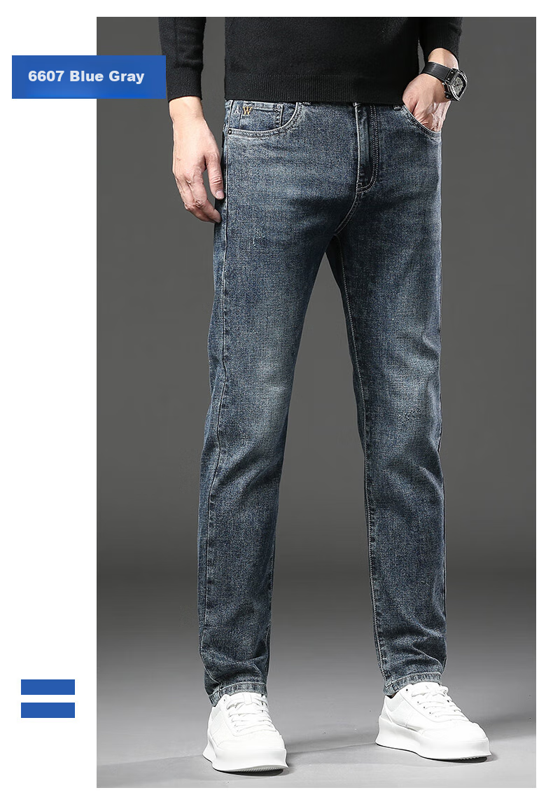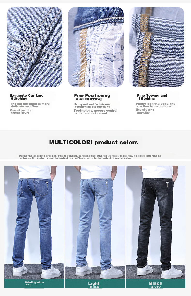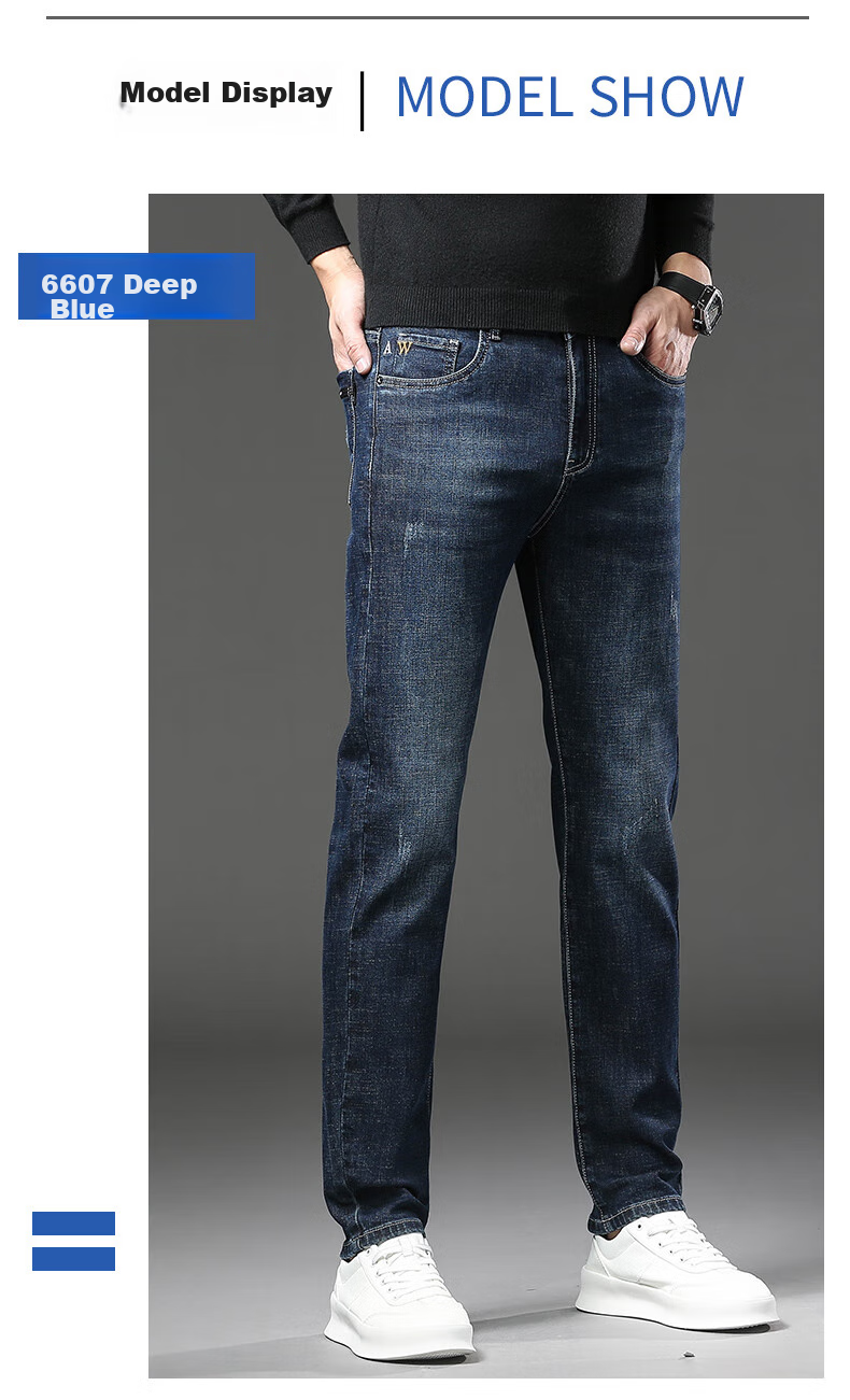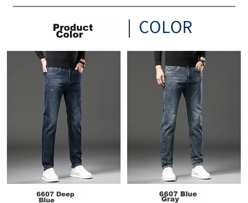 **Model Display:** Showcasing the jeans in Deep Blue and Blue Gray