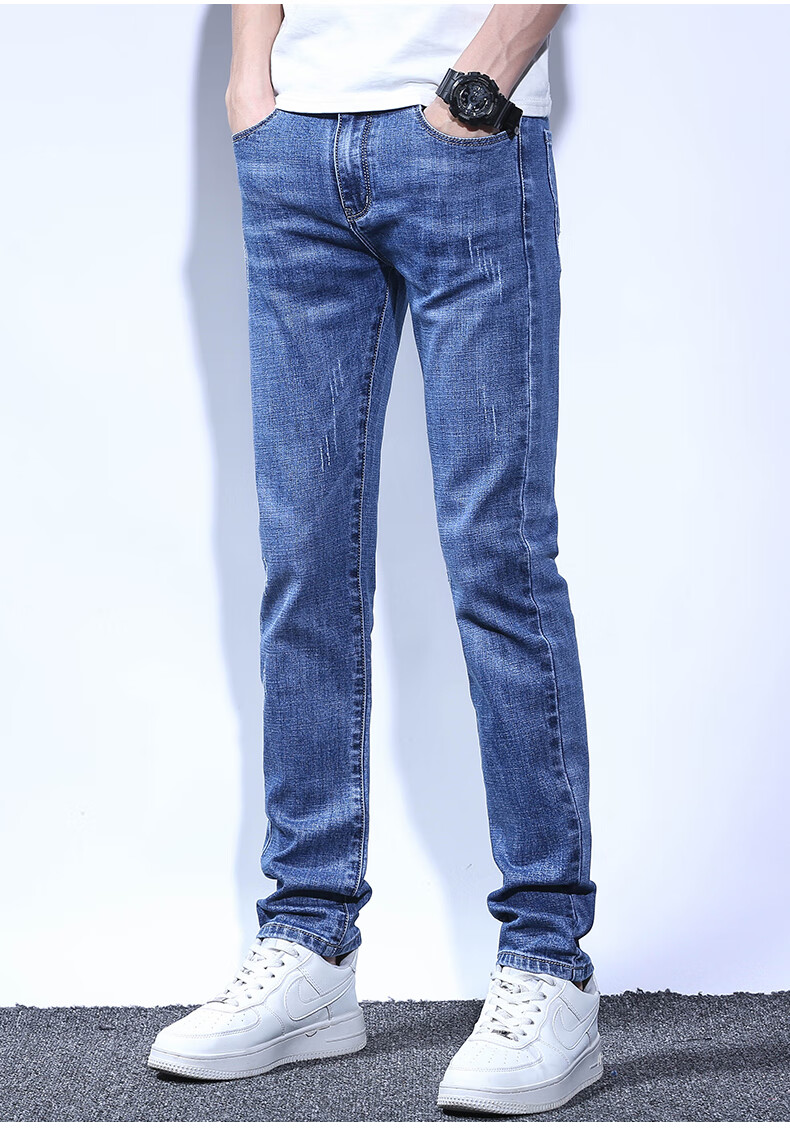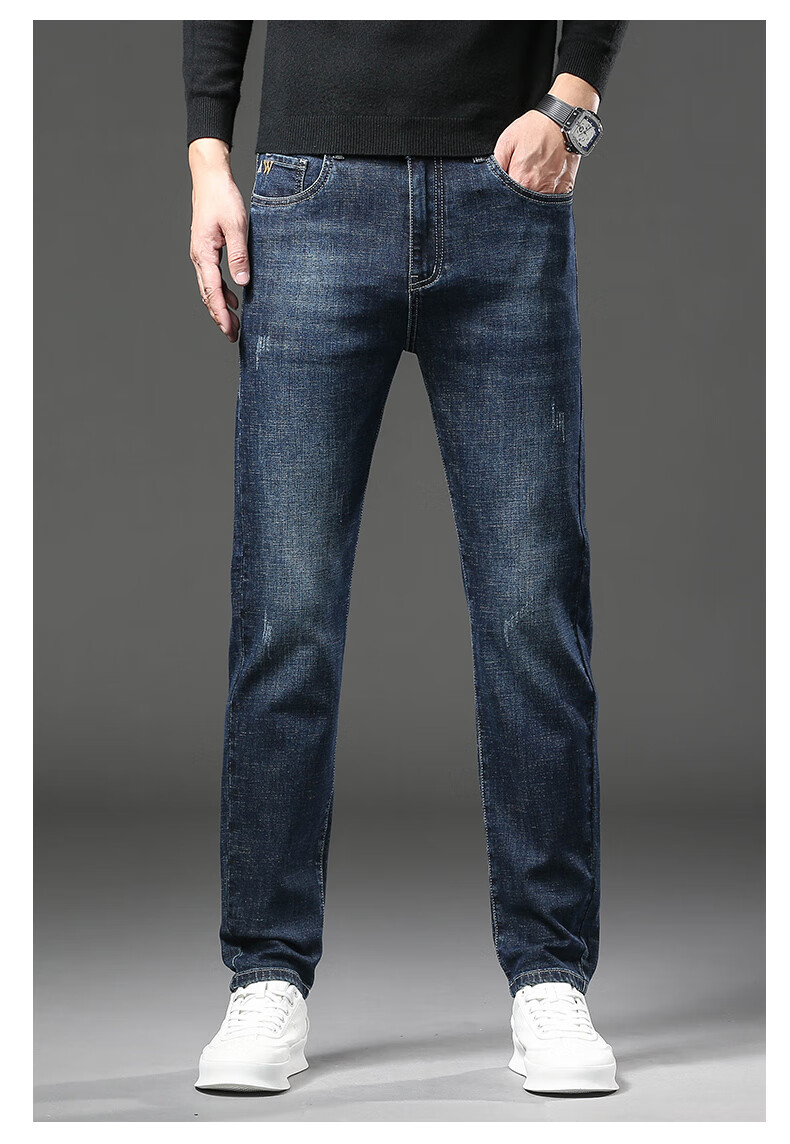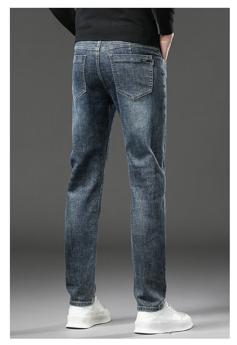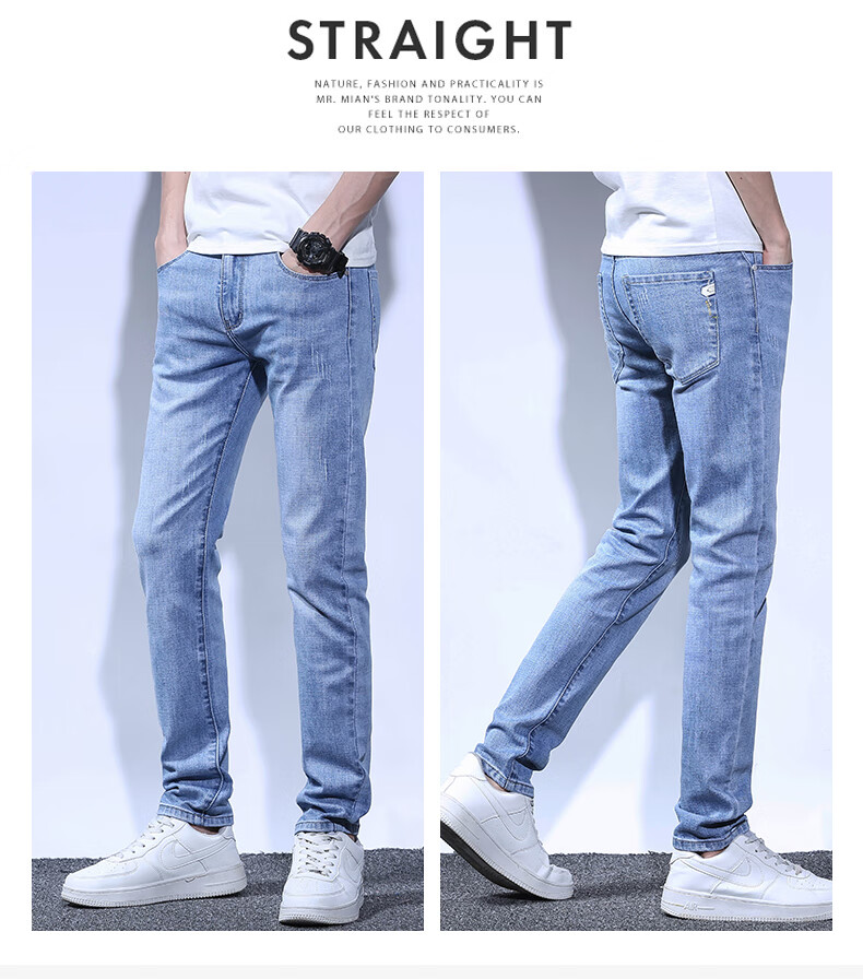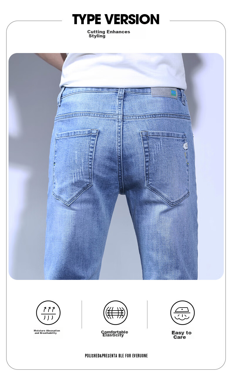 **Model Display:** Showcasing the jeans in Deep Blue and Blue Gray