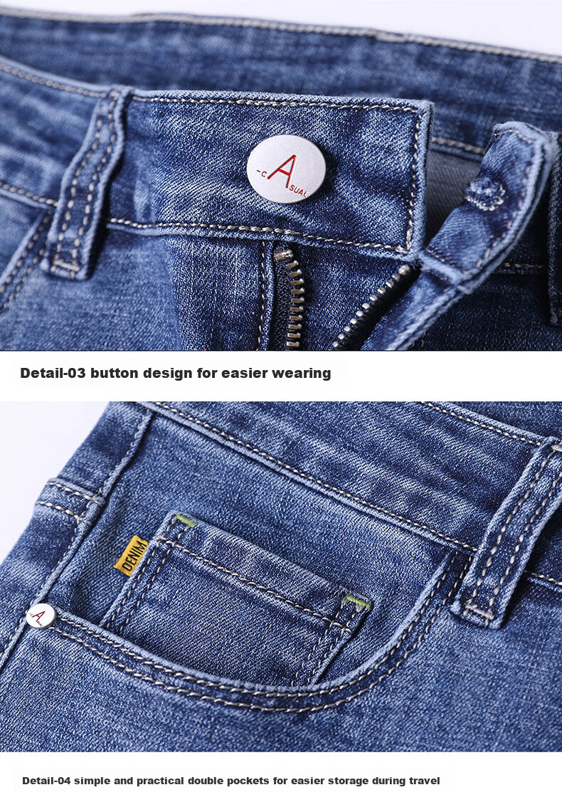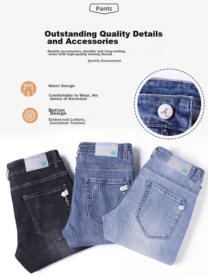 **Additional Details:** Waistband design for comfort, smooth metal zipper, convenient button closure, practical front and back pockets