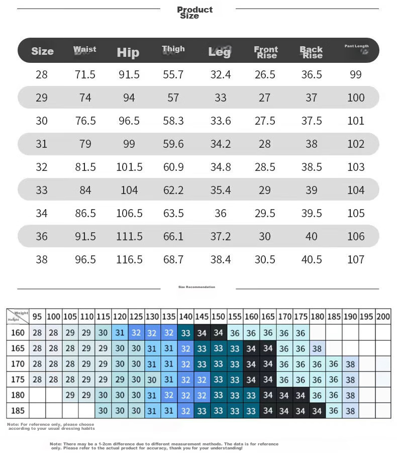 **Size Recommendations:** Detailed size chart based on waist, hip, thigh, inseam, and height/weight guidelines