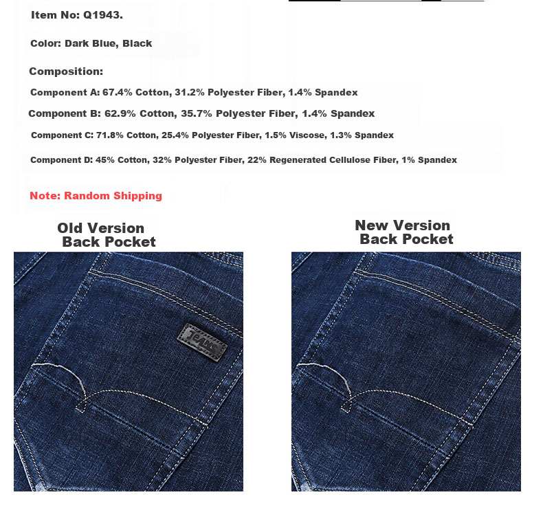 - Composition A: 67.4% cotton, 31.2% polyester fiber, 1.4% spandex
