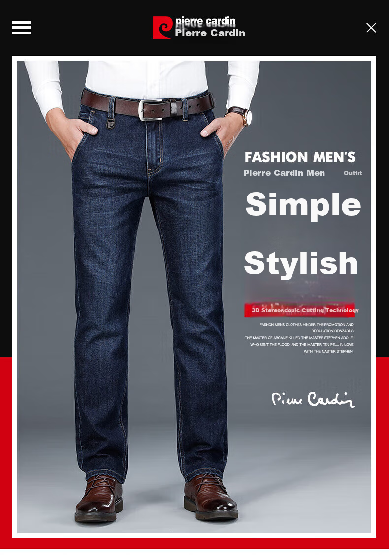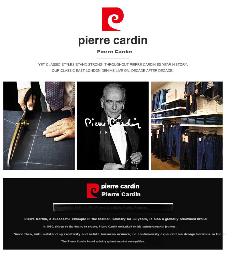 **Description:** Our classic East London denim lives on, decade after decade. Pierre Cardin, founded by Mr. Pierre Cardin in Paris, France in 1950, has been a successful and globally renowned brand in the fashion industry for over 50 years. Known for its creativity and visionary designs, Pierre Cardin quickly captured the market in the vibrant city of Paris.