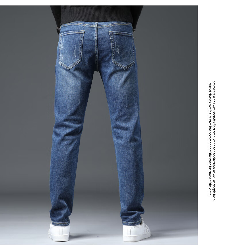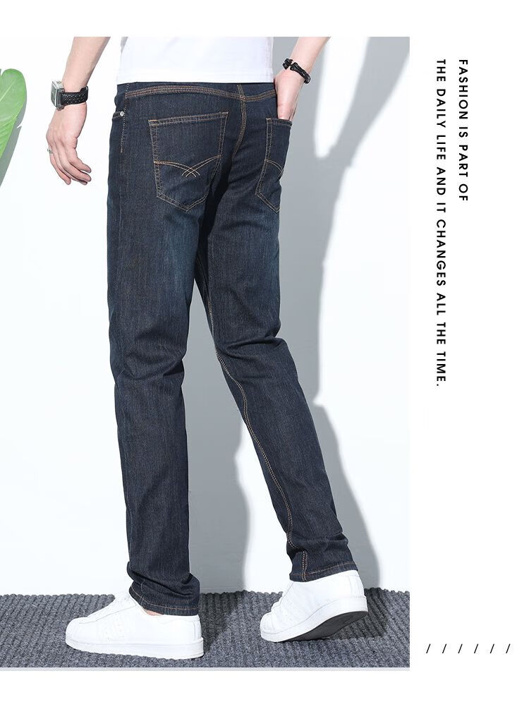 Features: Wear-resistant and wrinkle-resistant pant legs for an easy season. Model showcasing in blue. Fashion trends, details determine quality, versatile fit. Model showcasing in black. Pant style, design, straight-leg style. Versatile to wear. Pocket design with three-line fashionable and aesthetic design. O, 2, 1914 light blue. Product shows.