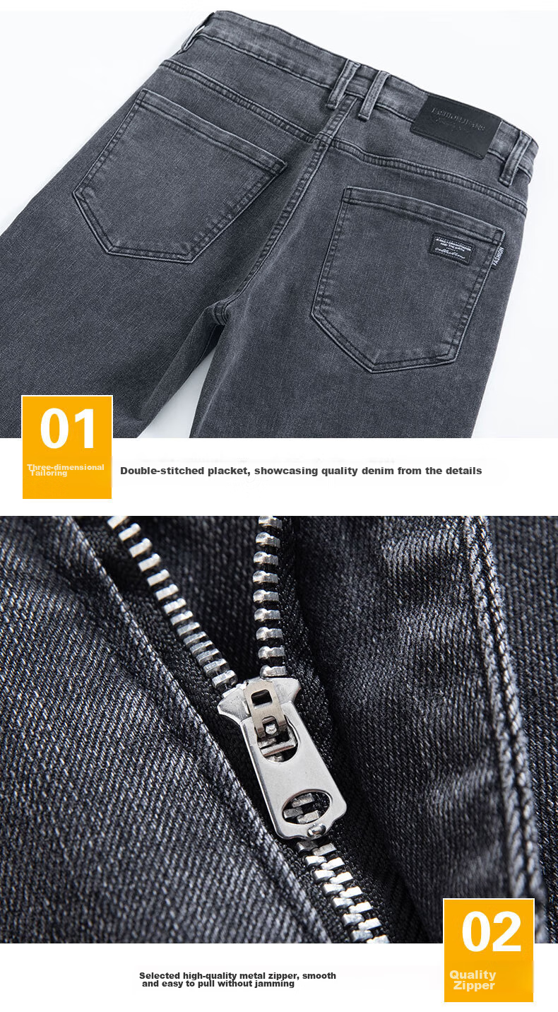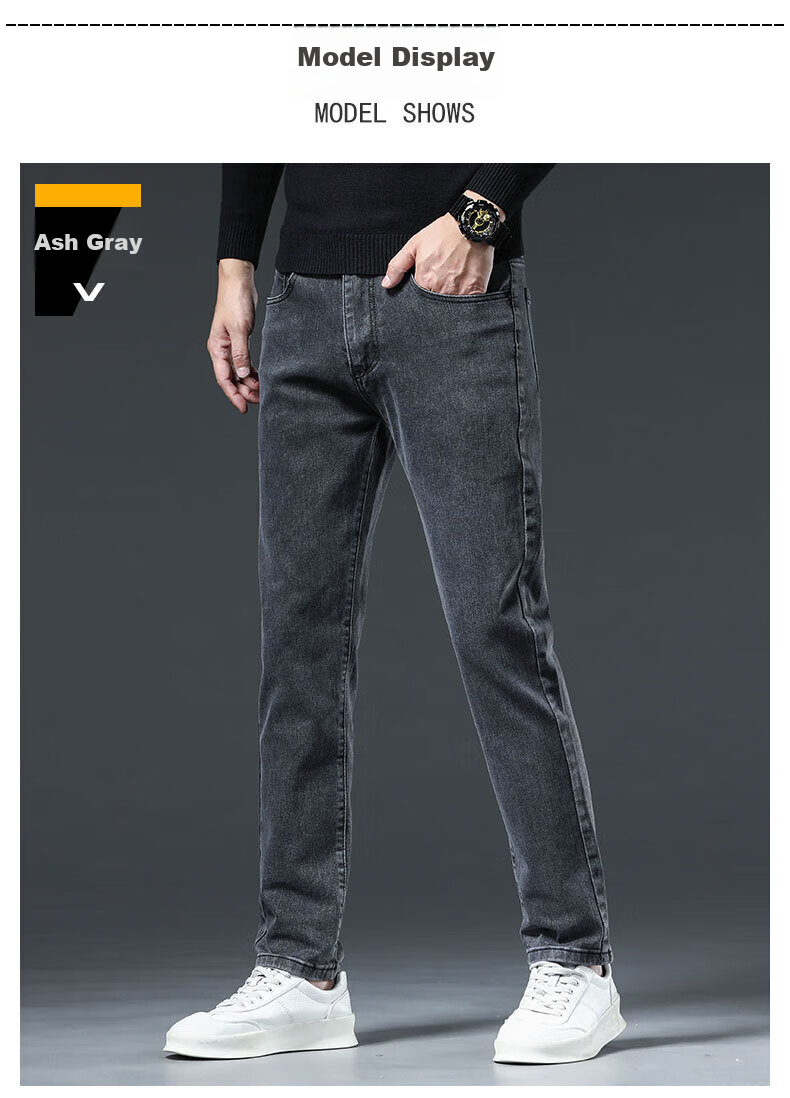 **Product Information:** Denim jeans with cotton-polyester blend fabric, available in smoke grey and black colors