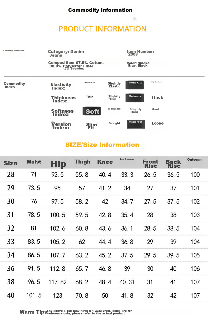**Size Range:** 29-42 with waist, hip, knee, ankle, front rise, and inseam measurements provided