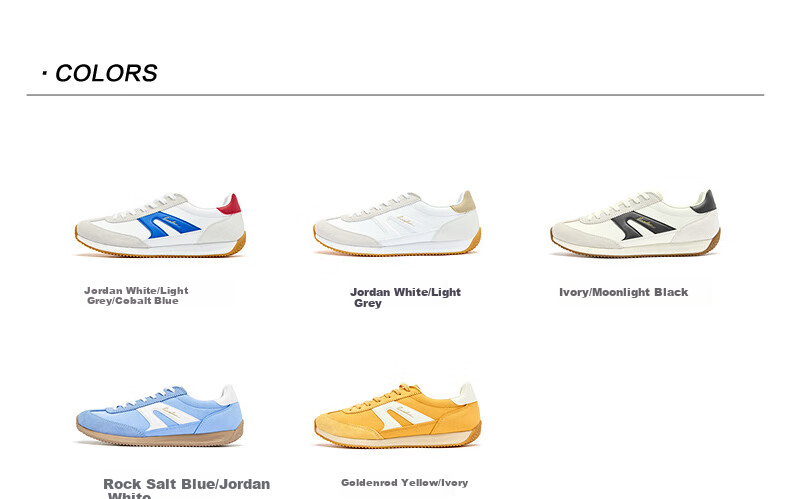 Colors: White/light gray/cobalt blue, white/light gray/ivory/moonlight black, salt crystal blue, white/golden yellow/ivory