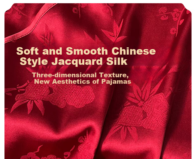 **Description:** Hongyun is in the ascendant, with a new aesthetic of Chinese silk pajamas. Adwantage, 4 major advantages: delicate and silky, soft and skin-friendly, SMOOTH, SOFT, instant coolness, Chinese clasp, COOLNESS, CHINESE CLASP. Soft and smooth silk with Chinese jacquard, three-dimensional texture, new aesthetic of pajamas. Soft and skin-friendly, delicate and smooth, no foreign body sensation when worn, high-density satin, allows you to comfortably enter a state of sleep, delicate and silky, with a delicate and soft three-dimensional embossed texture, self-contained, jacquard satin, luster, strict quality control, not easy to pull, naturally, truly soft, stiff:.
