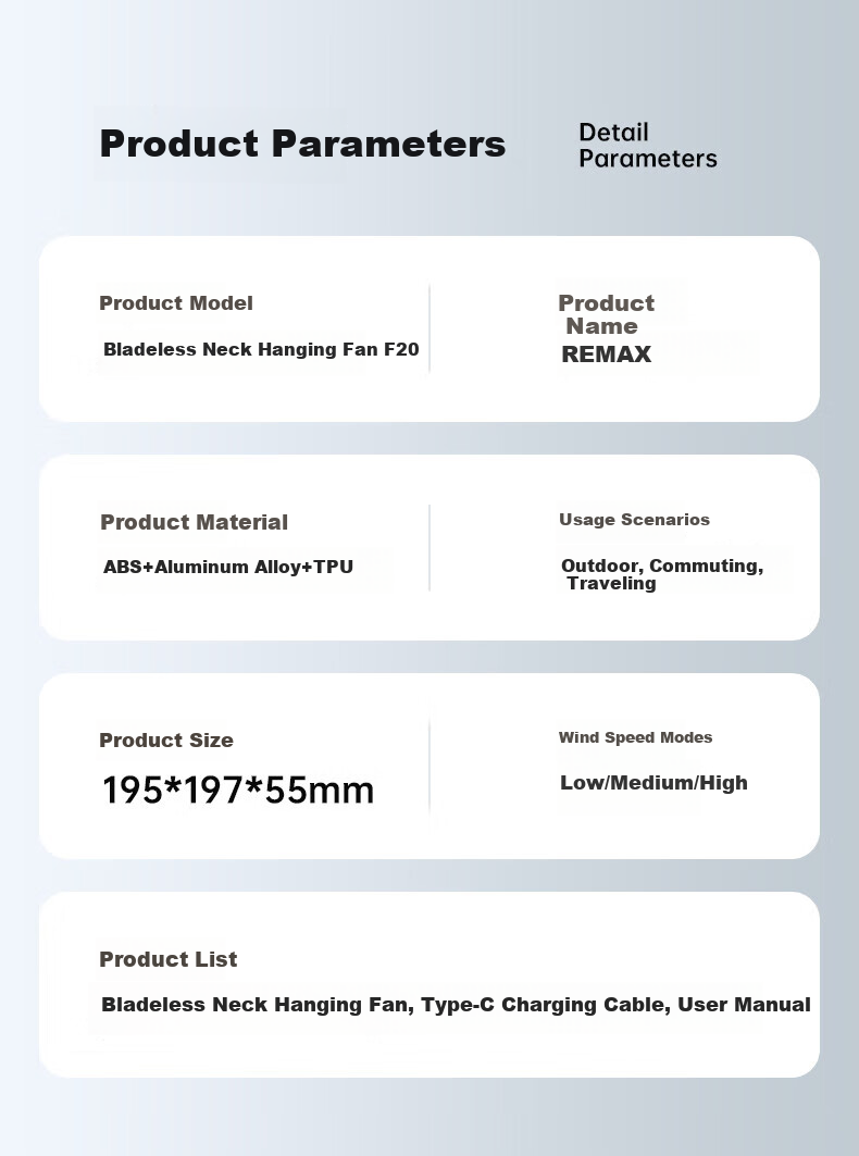 - **Model:** No-Blade Neck Hanging Fan F20, Remax AICE LITE