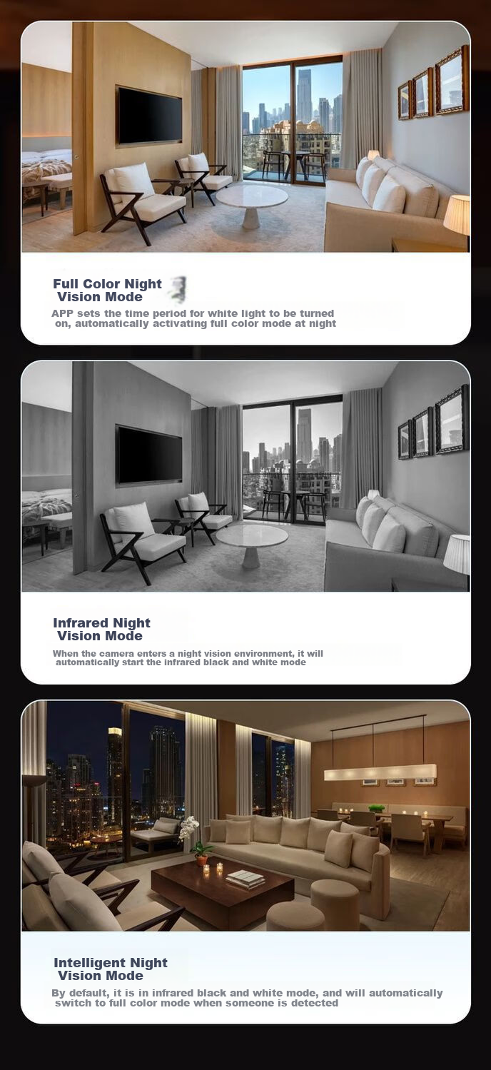 - Alarm methods: mobile push notifications, human detection, voice alerts