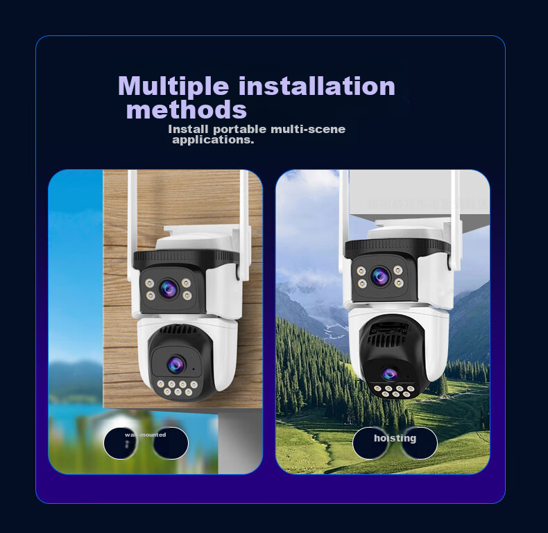 Dual PTZ 360° panoramic view, remote control via mobile phone, upper camera bracket for manual direction adjustment