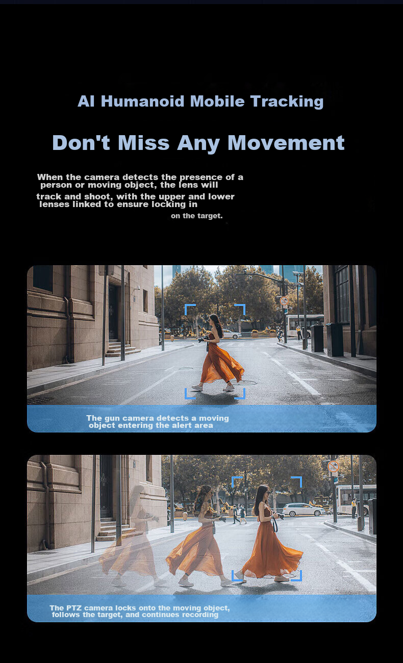 AI human movement tracking, ensure no movement goes unnoticed, cameras will track and shoot when detecting people or moving objects