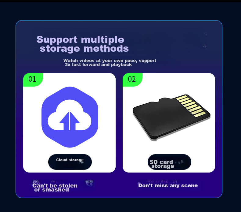Cloud storage, multiple storage options, support fast forward playback 2x, cloud storage, SD card storage