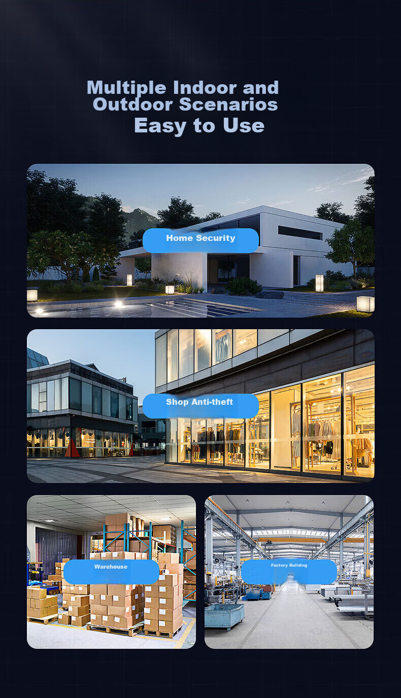 Suitable for indoor and outdoor multiple scenarios, easy to use for home security, shop anti-theft, warehouse, factory