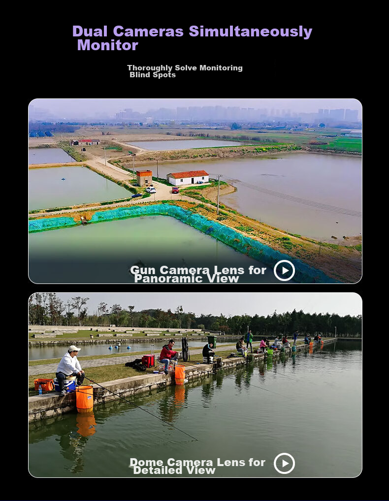 Dual cameras simultaneously monitor, solve blind spots in monitoring field of view, gun camera lens for panoramic view, dome camera lens for details