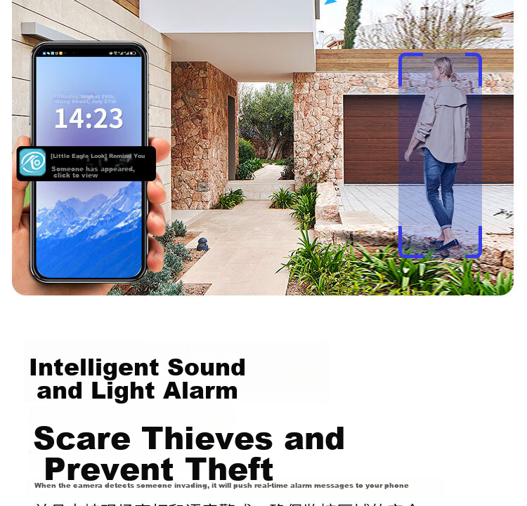 **Alert System:** Smart sound and light alarms for real-time notifications and deterrence