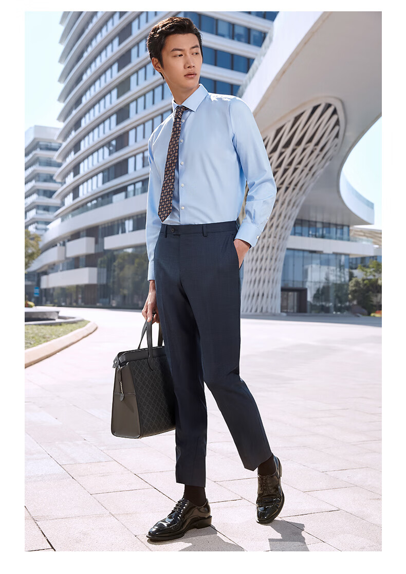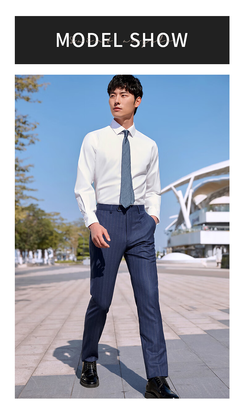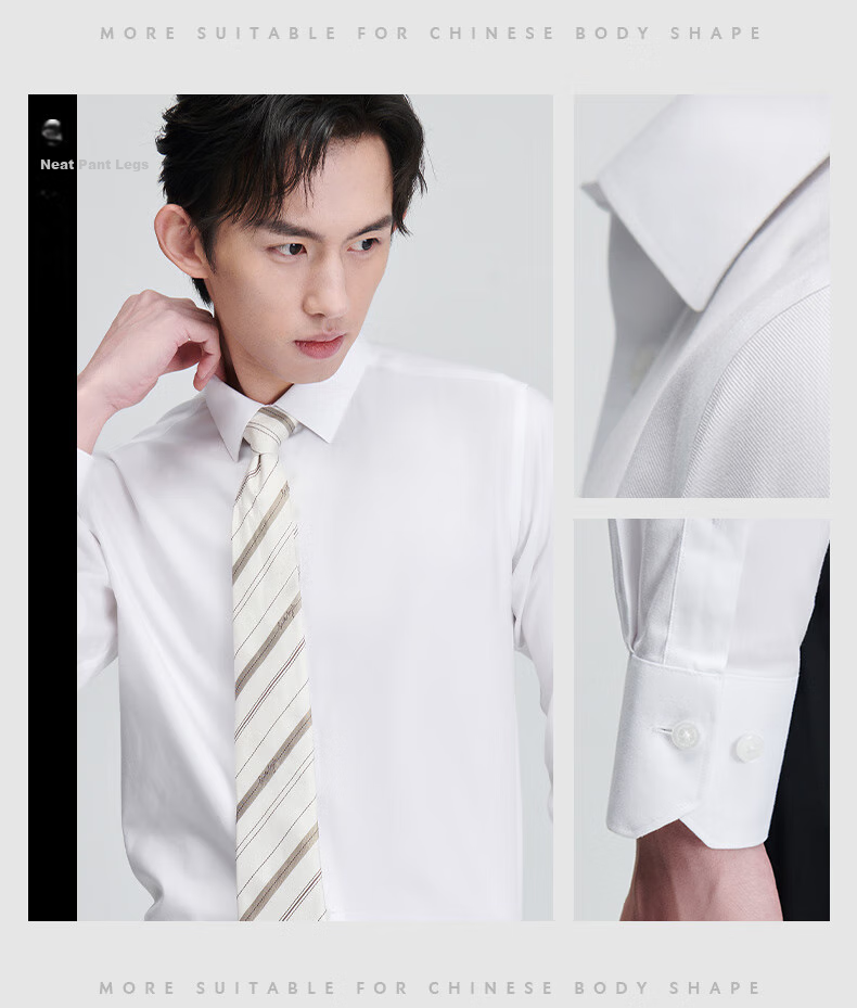 Features: Excellent silhouette with a tailored fit, reinforced collar, and sturdy construction. The shirt is designed to fit the Chinese body shape comfortably.