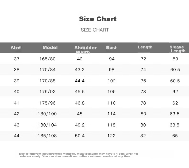 - 40: Shoulder 45.6, Chest 106, Length 78, Sleeve 62