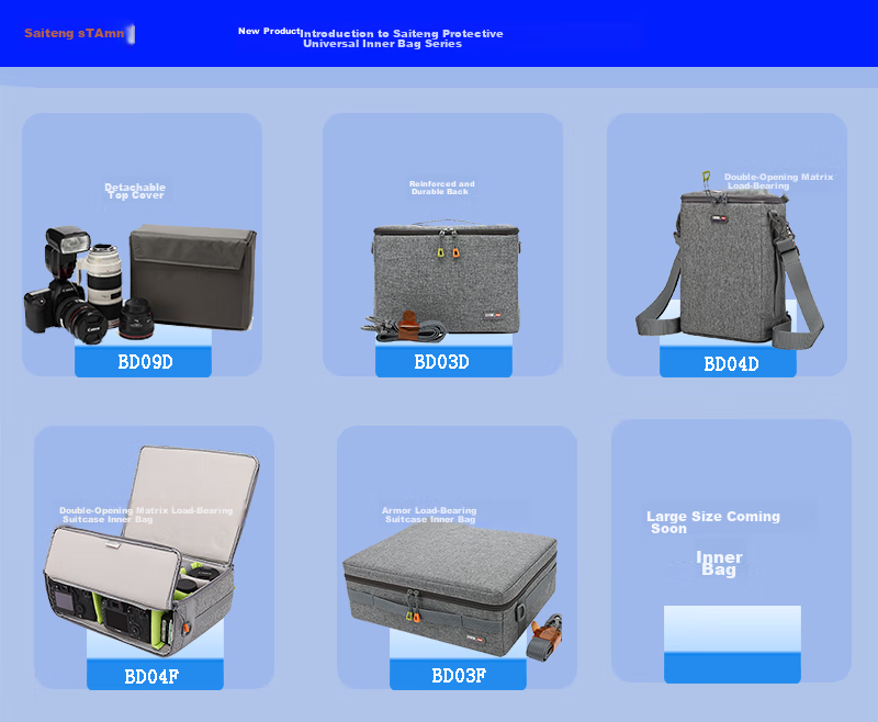 **Description:** Protective universal inner bag series with detachable top cover, reinforced and durable back, dual-opening matrix load-bearing design. Models include BD09D, BD03D, BD04D. Also introducing larger sizes: BD04F, BD03F.