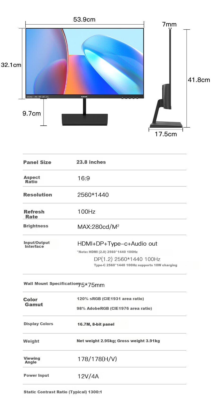 - VESA mount compatible (75*75mm)