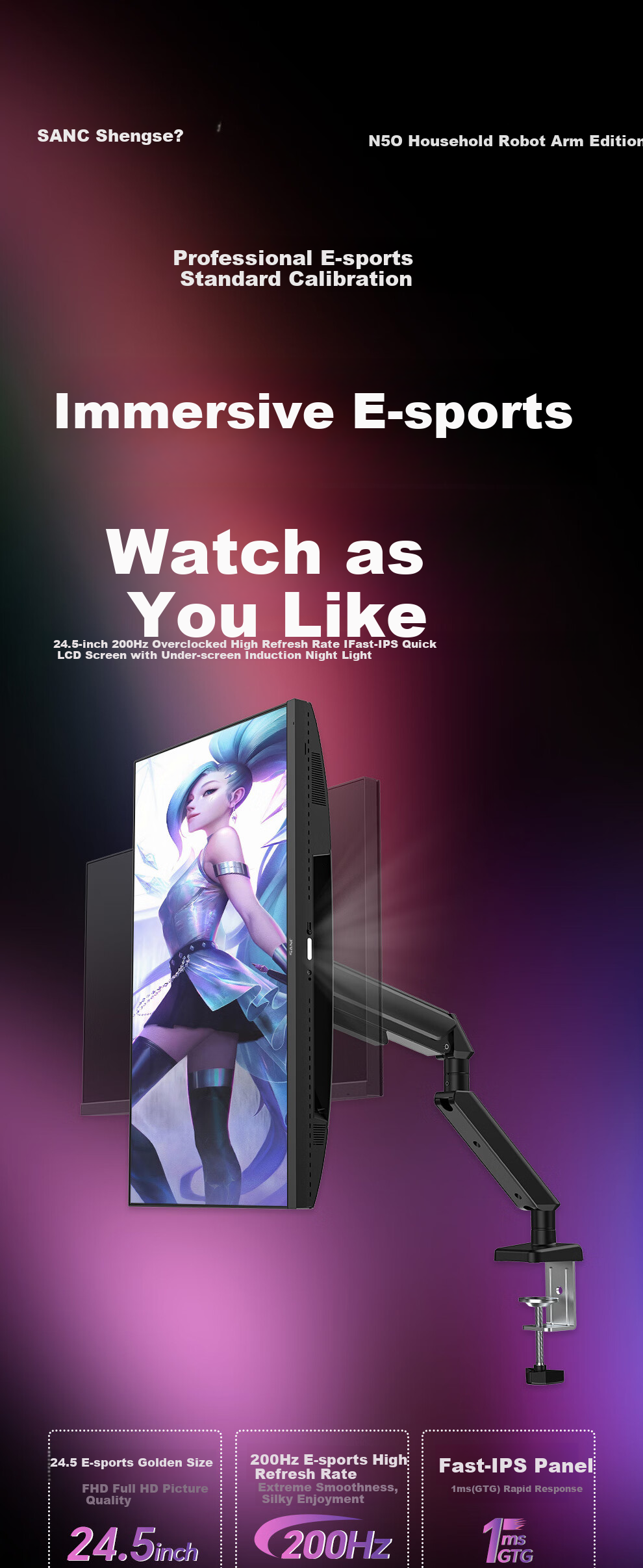 24.5-inch 200Hz overclocked high refresh rate IFast-IPS fast liquid crystal screen with under-screen sensing night light