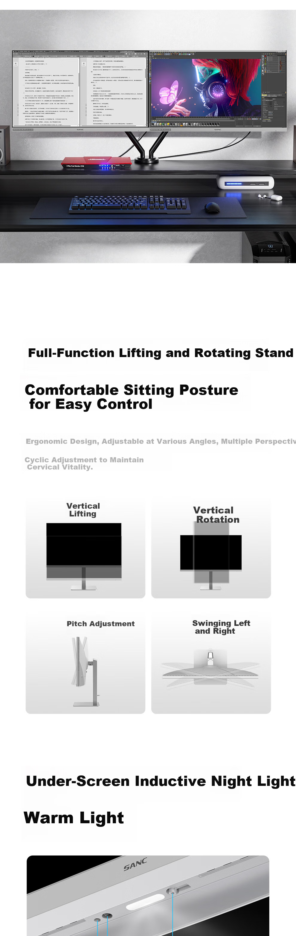 **Stand:** Full-function lifting and rotating stand, ergonomic design, multiple adjustments