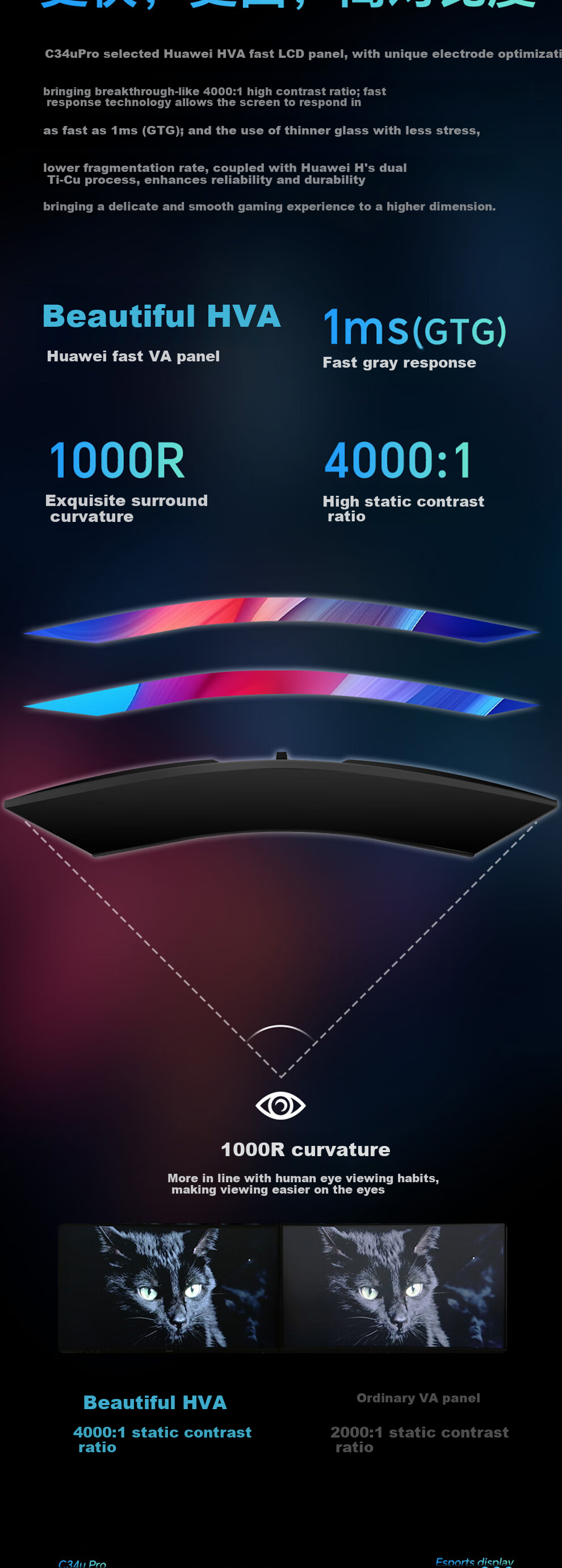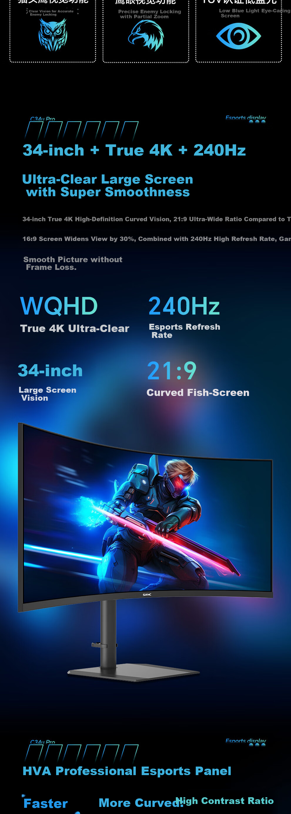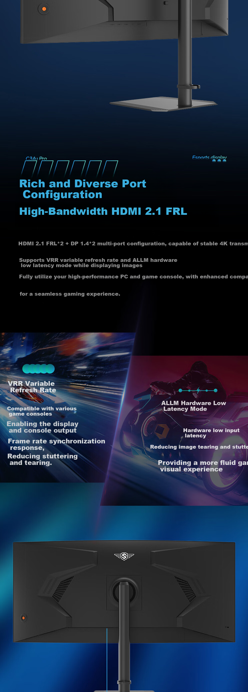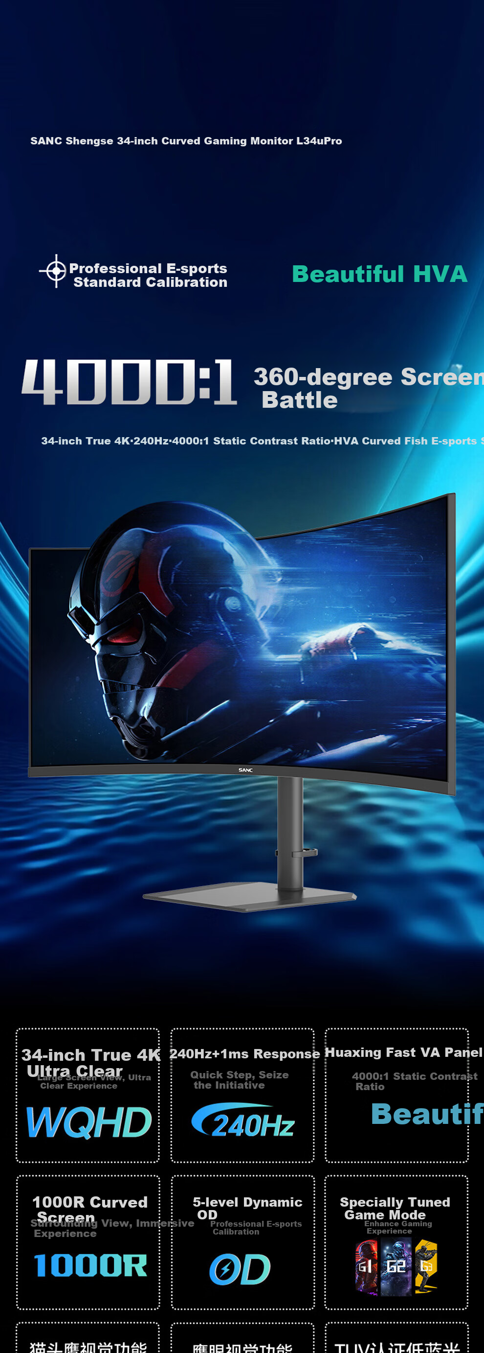 The SANC L34uPro is a 34-inch curved gaming monitor designed with professional esports standards in mind. It features a 4K resolution, 240Hz refresh rate, and a 4000:1 static contrast ratio for stunning visual clarity. The HVA panel technology ensures fast response times and smooth gameplay. With a curvature of 1000R, the monitor provides a more immersive viewing experience. Additionally, the monitor offers a variety of ports including HDMI 2.1 FRL and DP 1.4 for seamless connectivity with high-performance PCs and gaming consoles. The VRR and ALLM features reduce input lag and screen tearing, providing a smoother gaming experience.