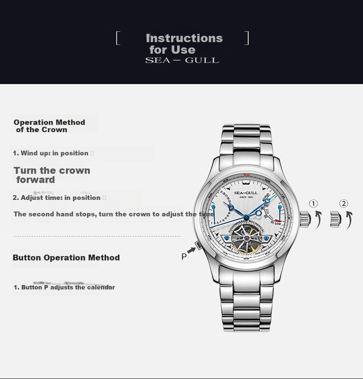 2. Time Setting: Pull the crown to position 2 to stop the second hand and adjust the time
