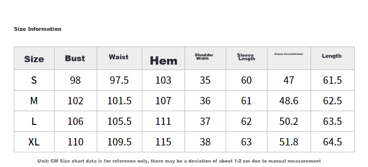 - XL: Bust 110, Waist 109.5, Hem 115, Shoulder 38, Sleeve Length 63, Sleeve Circumference 51.8, Length 64.5
