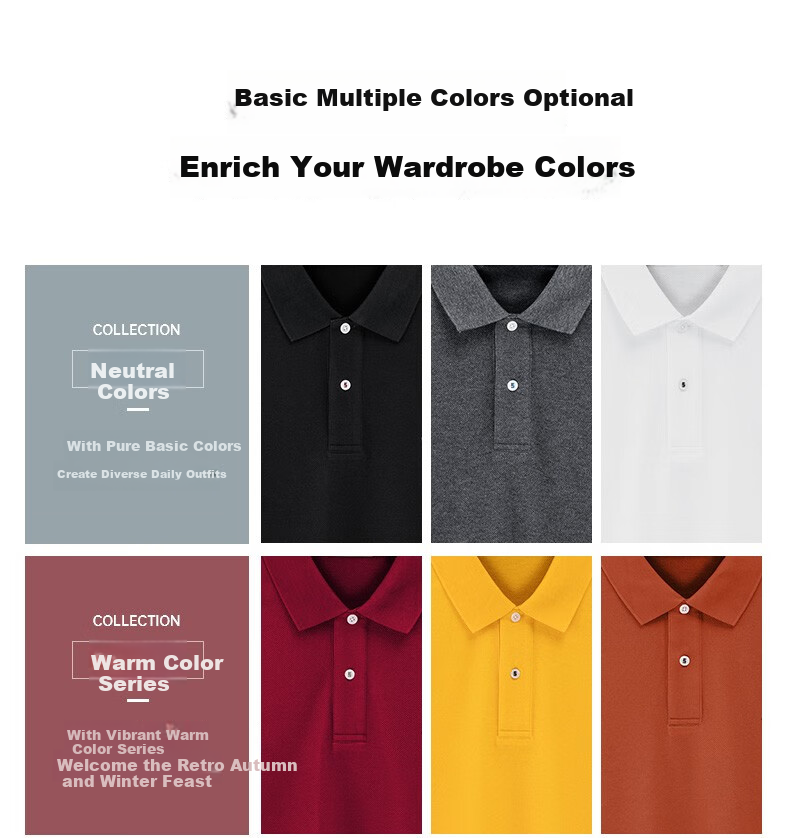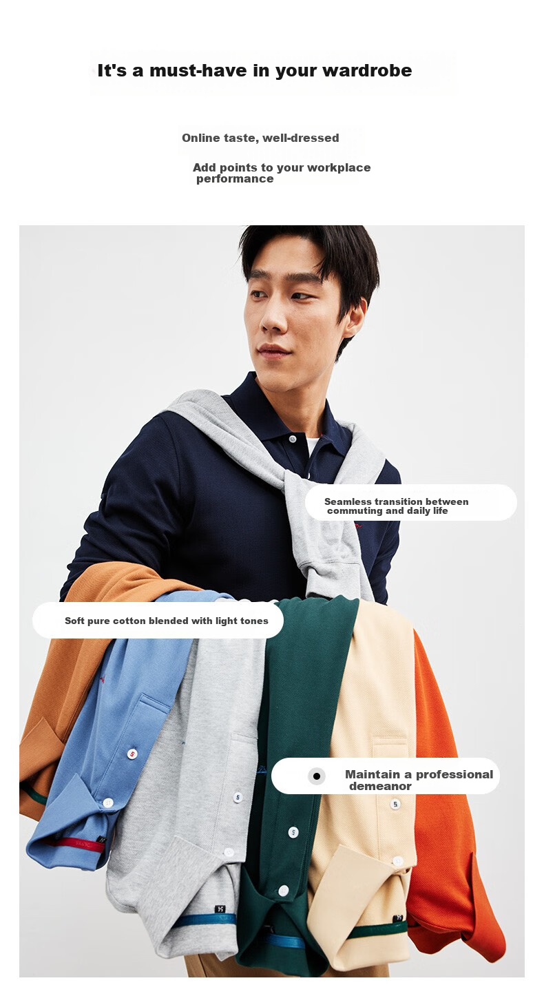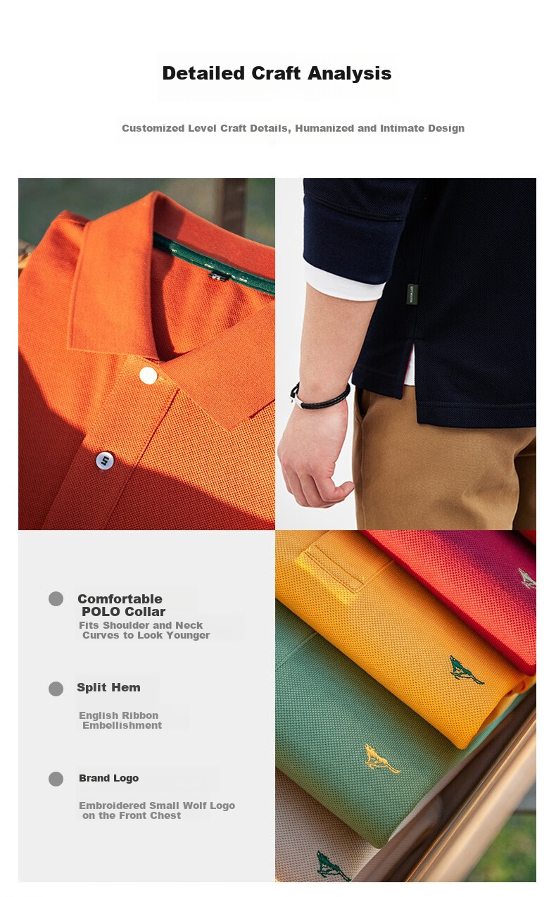 **Details:** Custom-grade craftsmanship, humanized and thoughtful design, comfortable POLO collar, fits the shoulder and neck curve, split hem, English tape embellishment, brand logo embroidery, and a variety of colors to enrich your wardrobe.