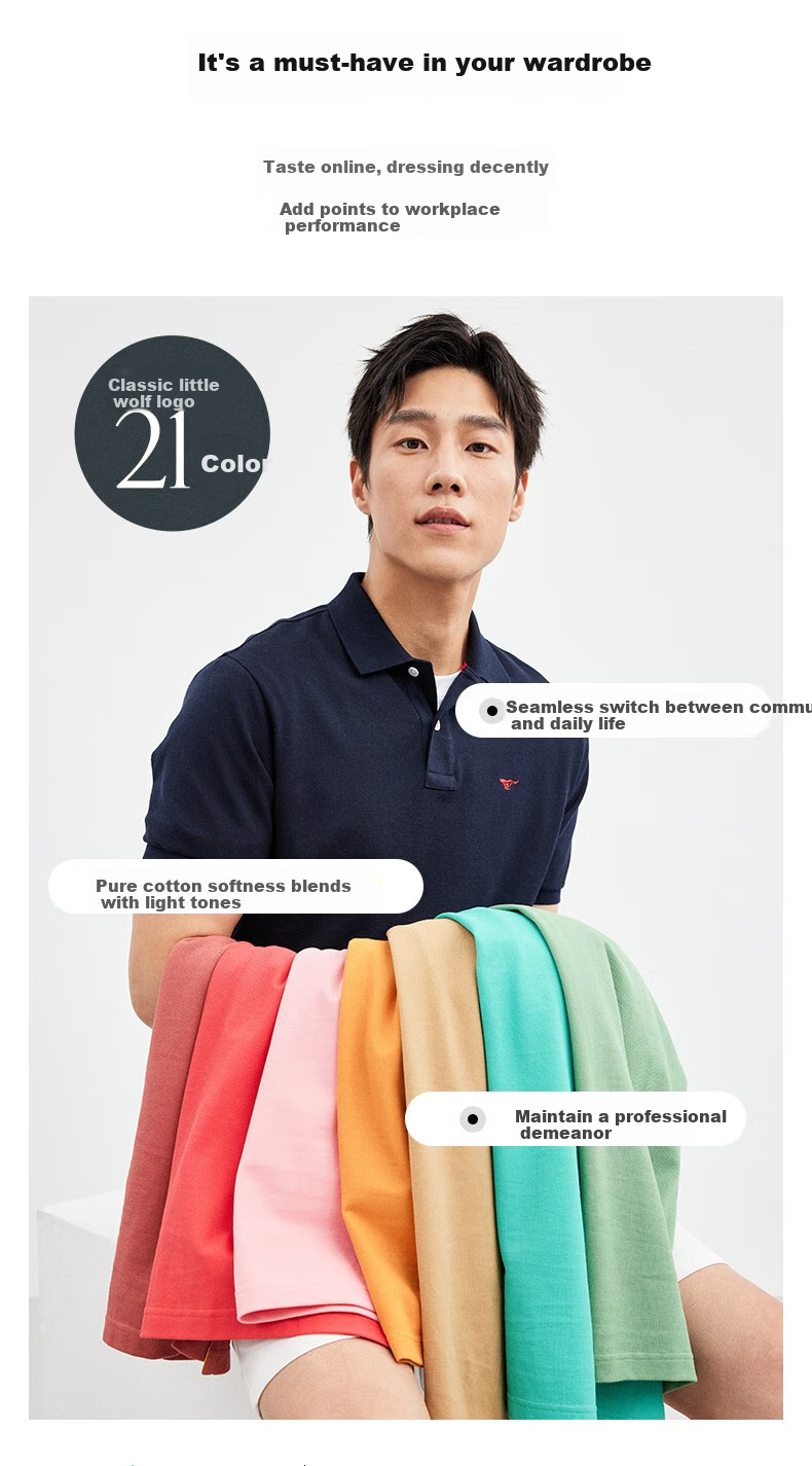 **Design:** Colorful Polo Series, Simple and Elegant Collar Design, Classic Small Wolf Logo Embroidery, Customized Craftsmanship, Comfortable Polo Collar, Brand Logo Embroidery