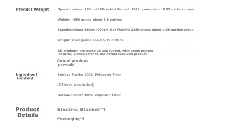 - 150cm×180cm Electric Blanket: Net weight 1845g, Gross weight 1950g