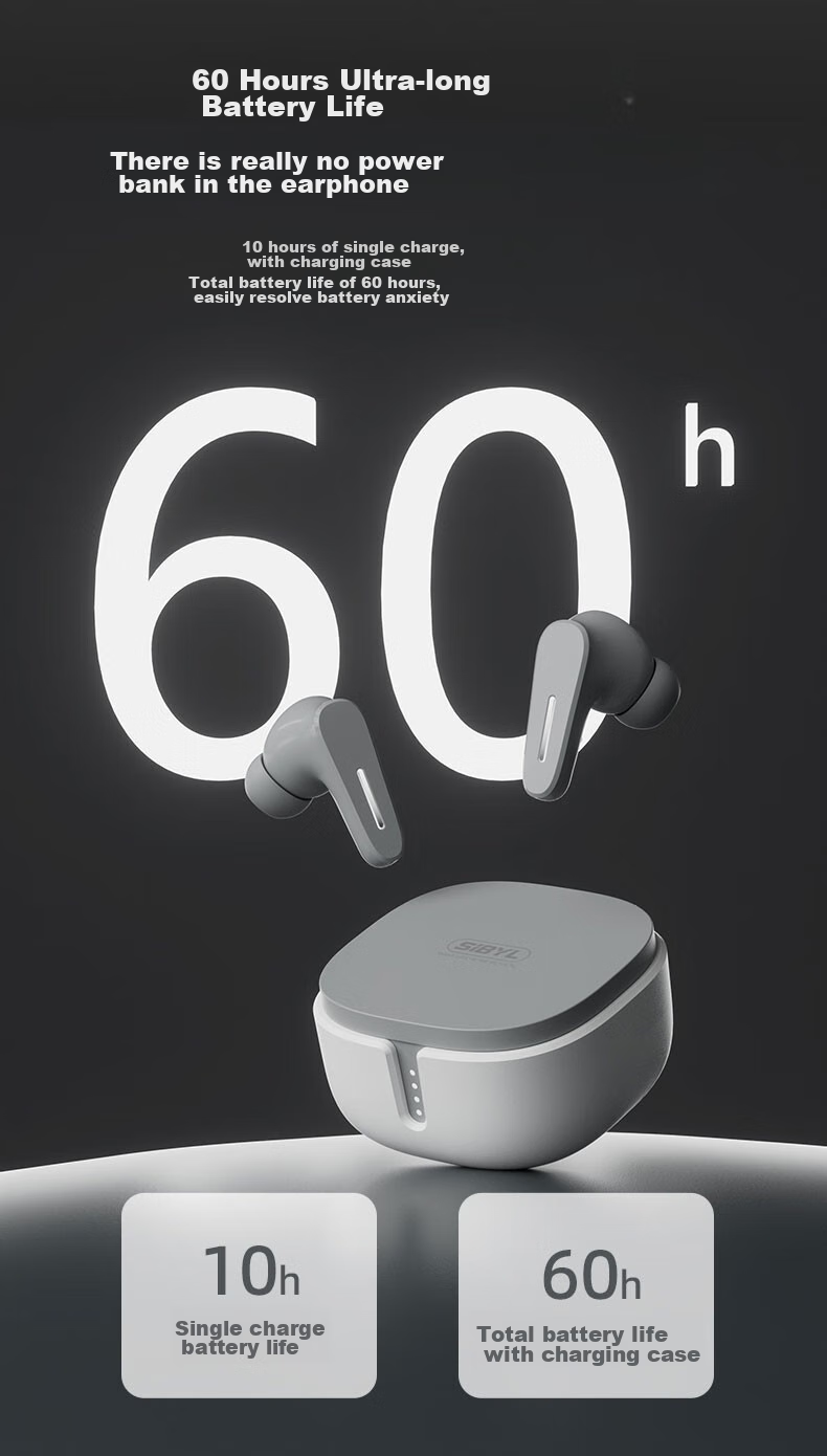 Battery life and charging times are based on tests conducted by Sibyl's laboratory and may vary depending on factors such as environment, device usage, volume levels, audio files, Bluetooth encoding, and charging conditions.