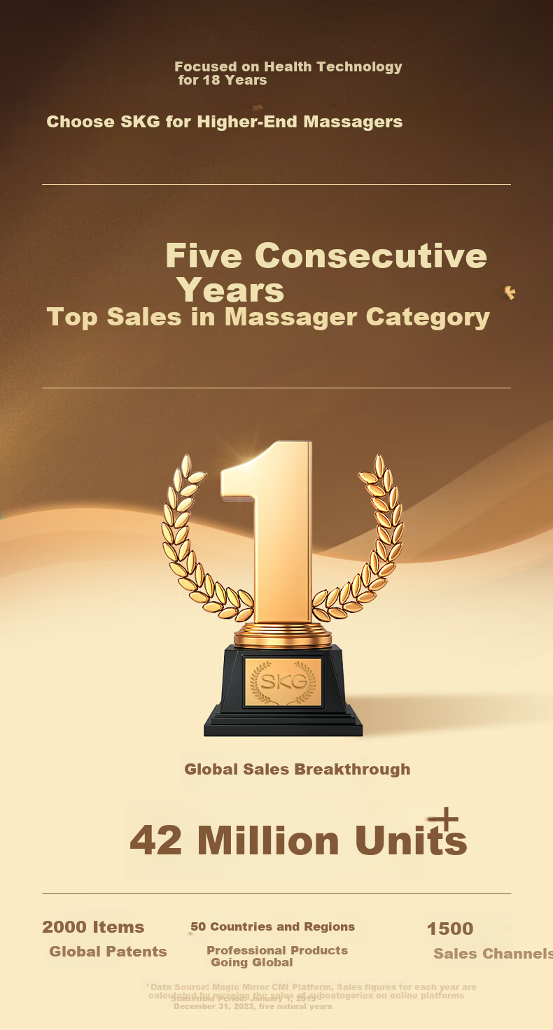 **Sales Performance:** SKG's massage devices have been the top-selling for five consecutive years, with global sales exceeding 42 million units across 50 countries and regions.