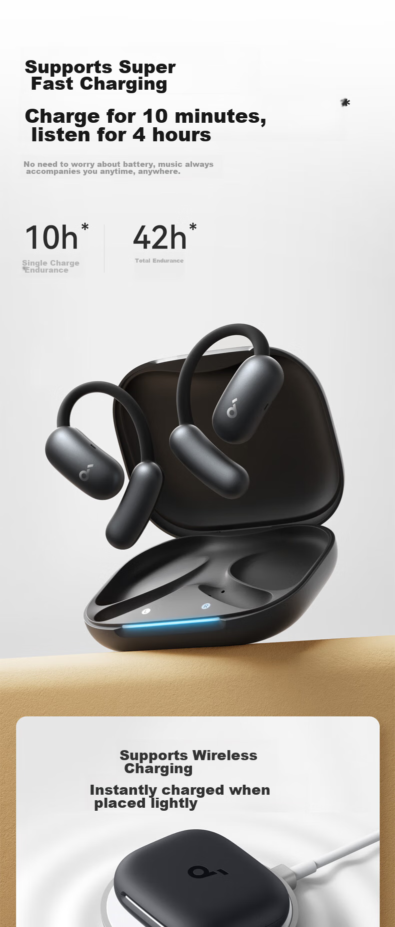 **Battery Life:** Up to 10 hours per single charge; 42 hours total with charging case