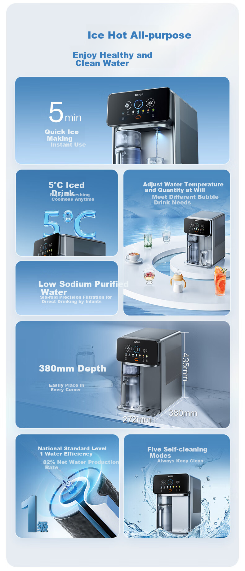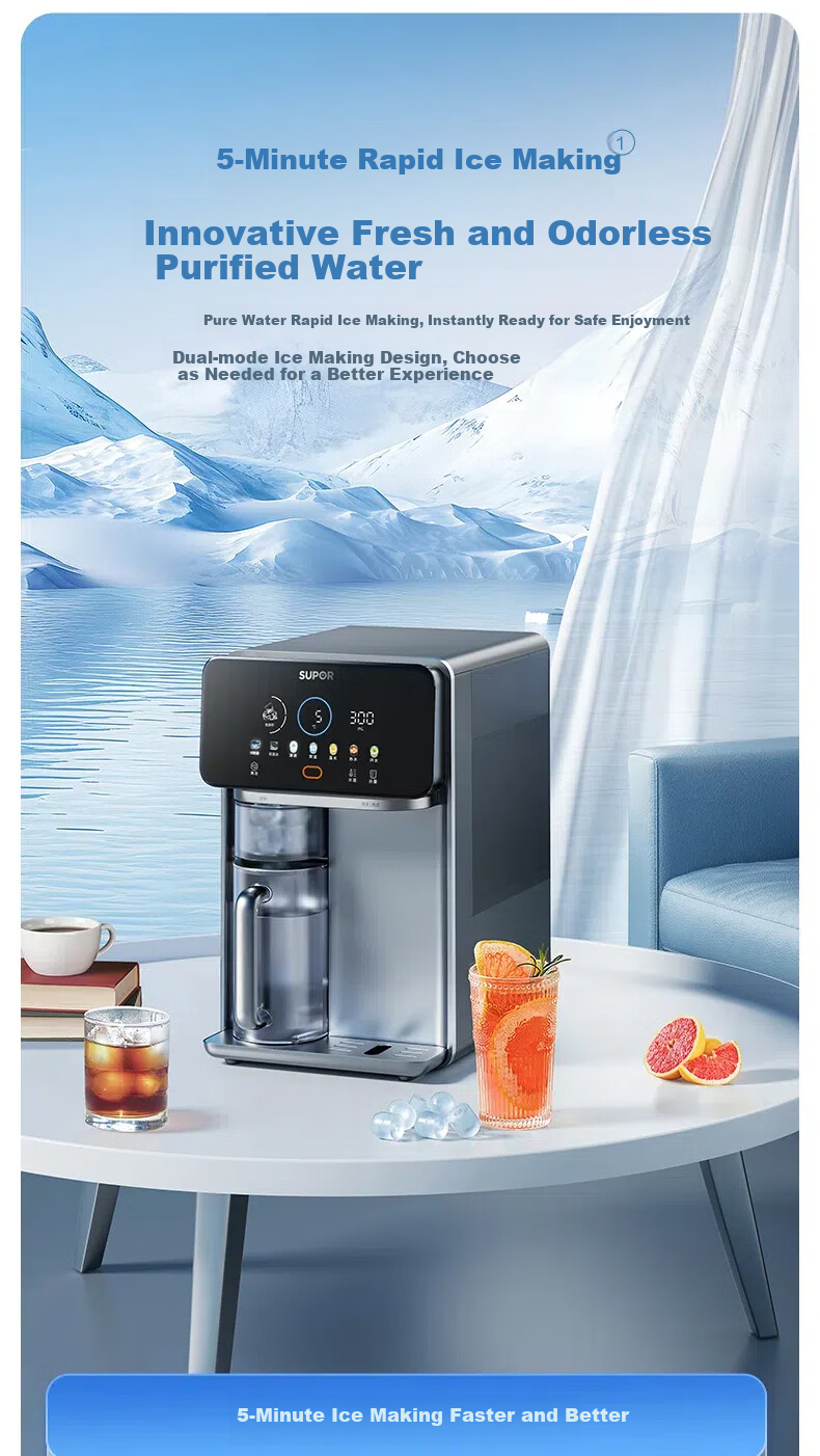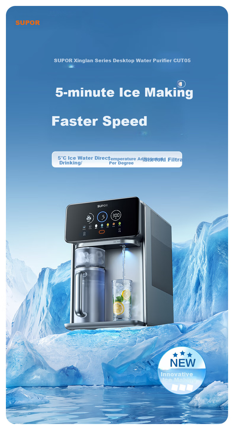 This SUPOR CUT05 Starry Series Desktop Water Purifier offers innovative ice making technology, instant hot and cold water, and customizable settings to meet various drinking needs.