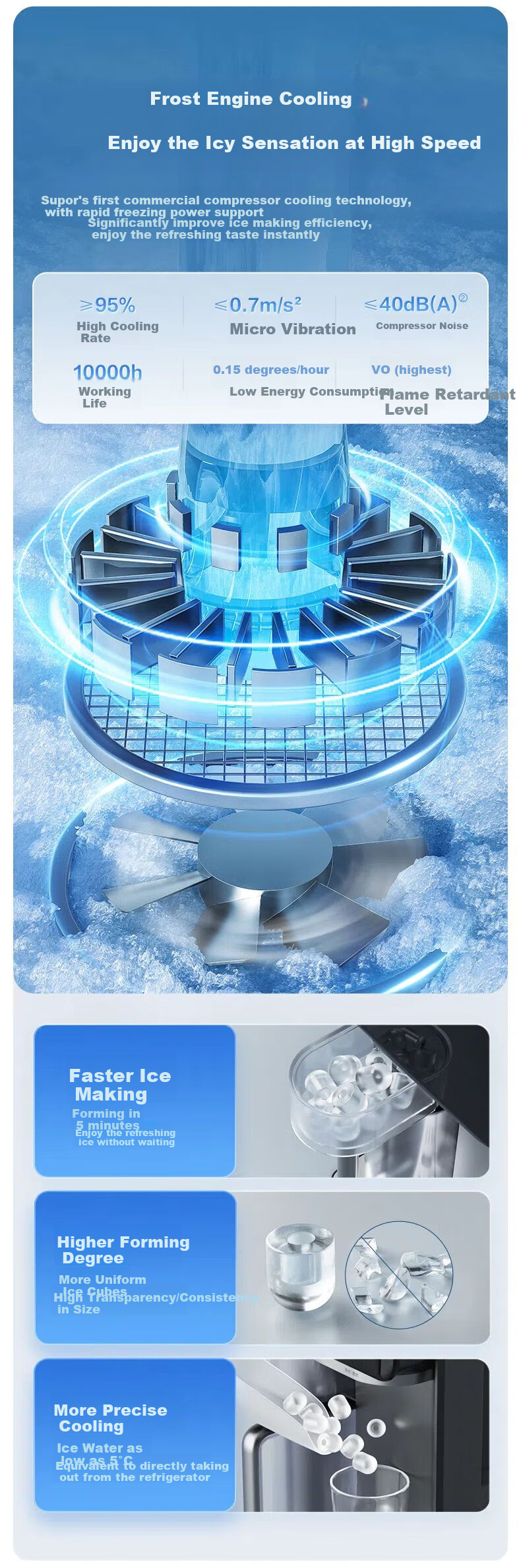 **Ice Making Technology:** Frost Engine cooling system, commercial-grade compressor for rapid ice making