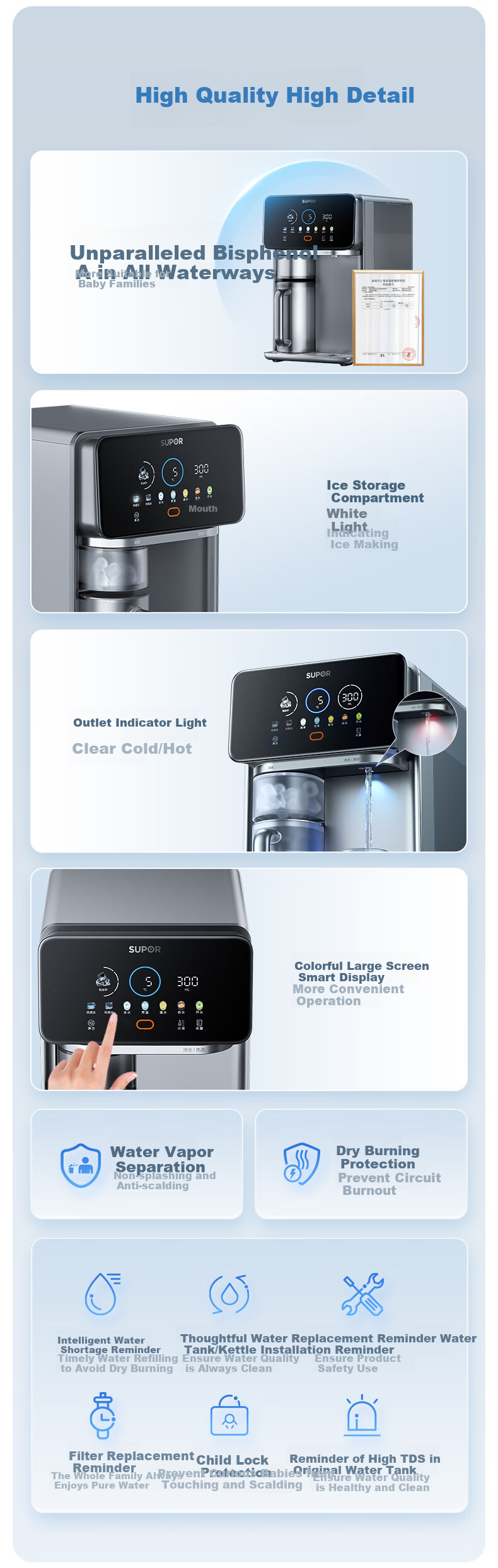 **Safety Features:** BPA-free waterways, child lock protection, water shortage reminder, filter replacement reminder