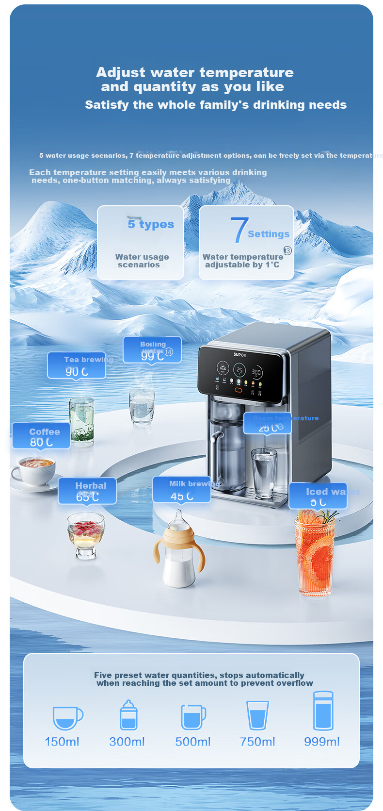 **Water Volume Settings:** 5 levels, from 150ml to 999ml