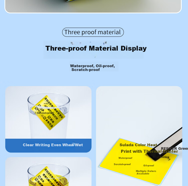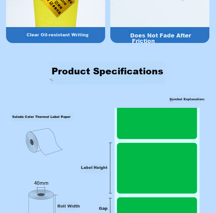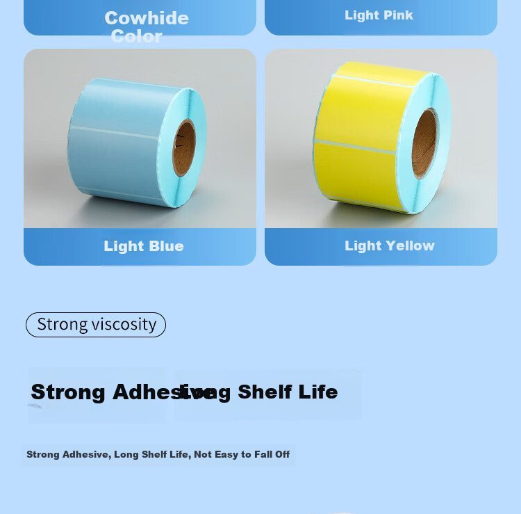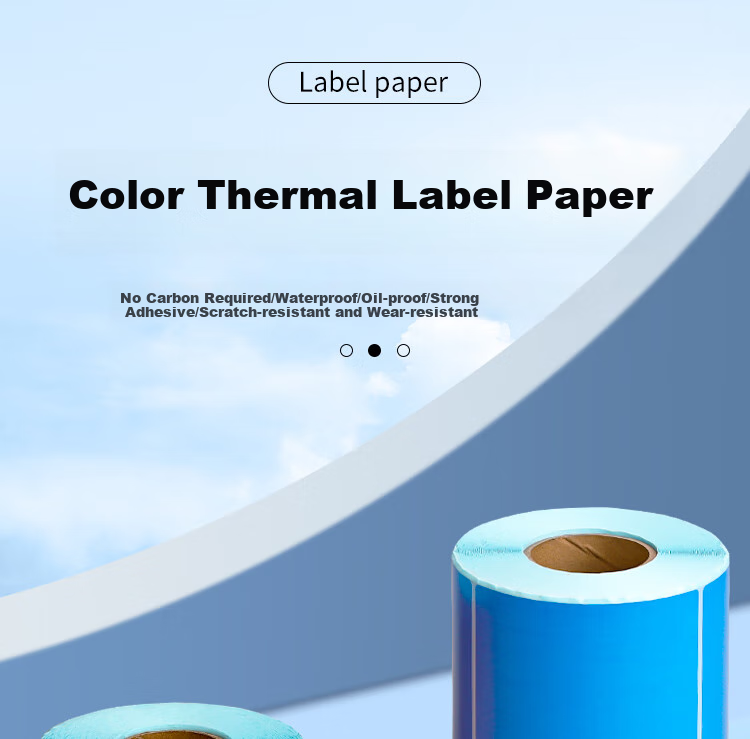 **Description:** Colored thermal label paper, no need for carbon ribbon, waterproof, oil-proof, strong adhesion, scratch-resistant and durable.