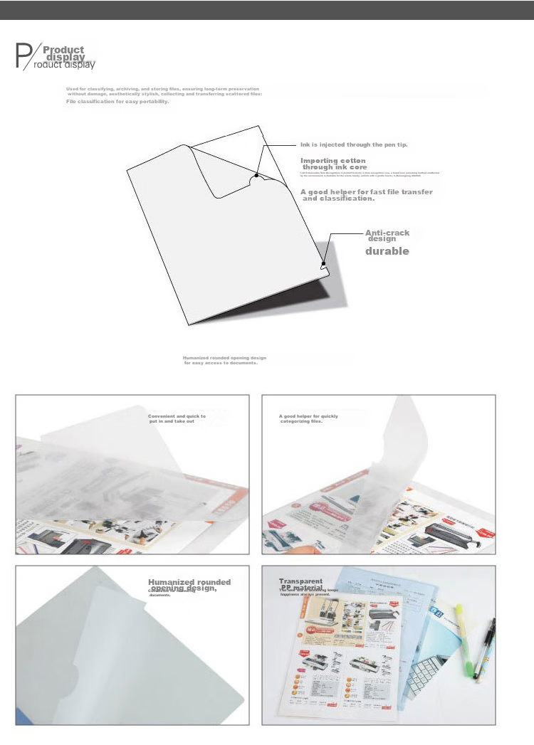Product Display: Ideal for file classification, archiving, and storage. Durable and stylish design for collecting and transferring scattered files. Features a user-friendly rounded opening design for easy file access. Standard size for lightweight and flat sheets. Crack-resistant and long-lasting. Transparent PP material for easy file viewing. Suitable for quick and efficient file classification.