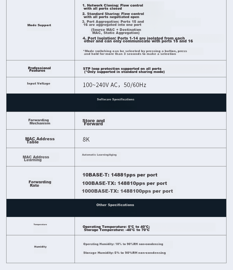 - - Forwarding Rate: 10BASE-T: 14881pps per port, 100BASE-TX: 148810pps per port, 1000BASE-TX: 1488100pps per port