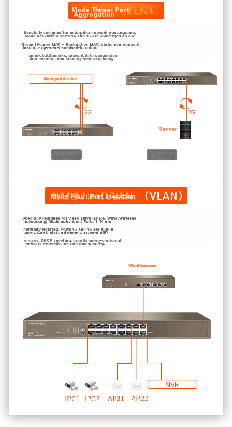 - Mode 4: Port Isolation (VLAN) for video surveillance, wired/wireless networking