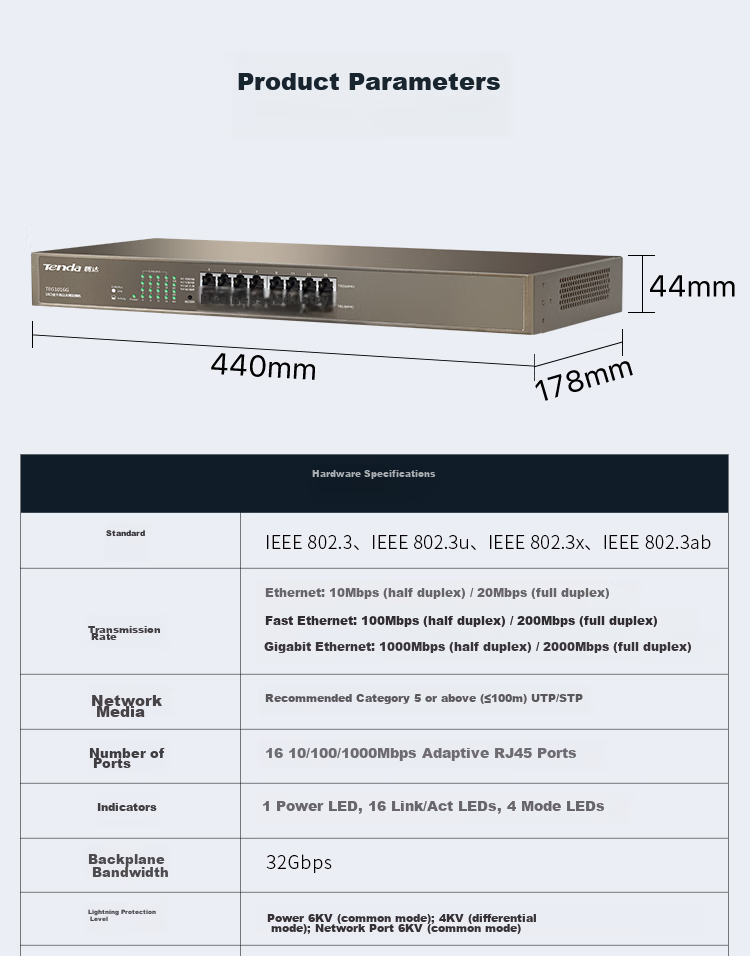 - - Port: 16 10/100/1000Mbps adaptive RJ45 ports
