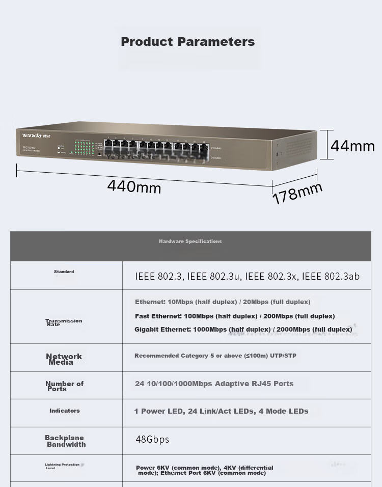 - Port Count: 24 x 10/100/1000Mbps RJ45 ports